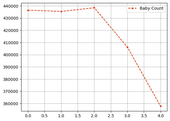 pyplot.plot(newborn, label="Baby Count", linestyle="--", marker=".", color="#ff2900")