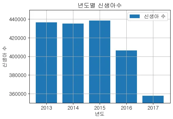 pyplot.xticks([0, 1, 2, 3, 4], year) #x축의 각 위치에 year값을 라벨로 적용
