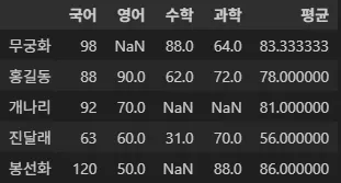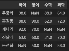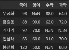 # 이상치를 갖는 인덱스에 대한 국어 점수를 결측치로 변경