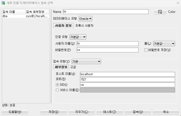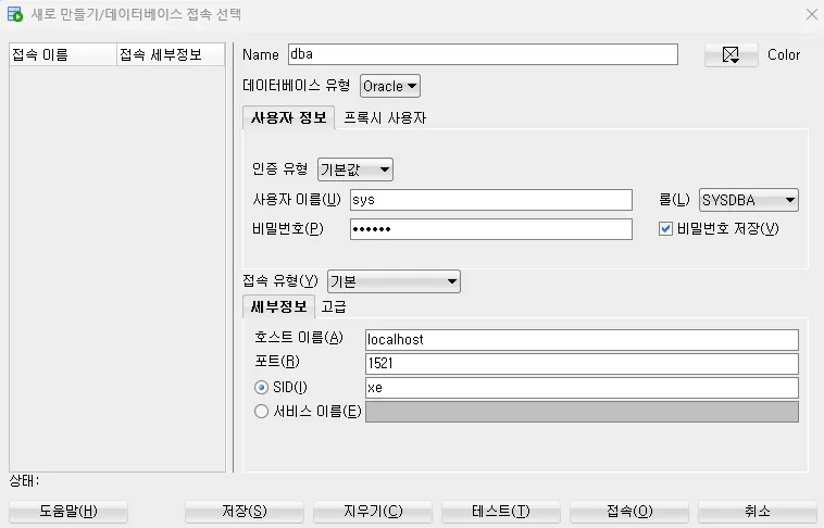 - 비밀번호 : oracle(설치할 때 설정한 비밀번호)