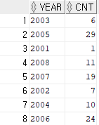 FROM (SELECT to_char(hire_date, 'yyyy') year, count(*) cnt