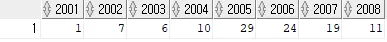 PIVOT (max(cnt) FOR year in ('2001' "2001", '2002' "2002", '2003' "2003", '2004' "2004", '2005' "2005", '2006' "2006", '2007' "2007", '2008' "2008"));