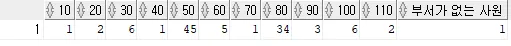 PIVOT (count(*) FOR department_id IN (10, 20, 30, 40, 50, 60, 70, 80, 90, 100, 110, null "부서가 없는 사원"));