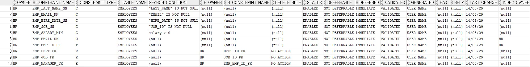 SELECT * FROM dba_constraints WHERE owner = 'HR' AND table_name = 'EMPLOYEES';