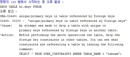 - 참조하고 있는 제약 조건이 있을 경우 테이블 삭제 불가