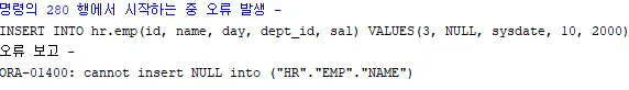 - name 컬럼에 not null 제약 조건이 생성되어 있기 때문에 null 값은 불허