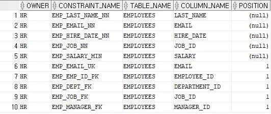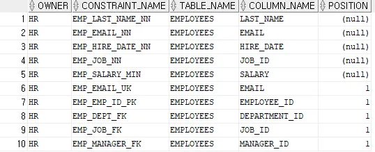 SELECT * FROM dba_cons_columns WHERE owner = 'HR' AND table_name = 'EMPLOYEES';