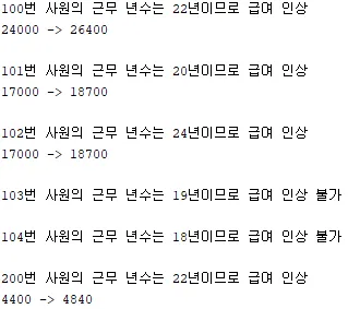 -- [문제12] 배열 변수에 있는 100,101,102,103,104,200 사원들의 근무 년수를 출력하고 근무 년수가 20년 이상이면 salary를 10% 인상하는 프로그램을 작성해주세요.