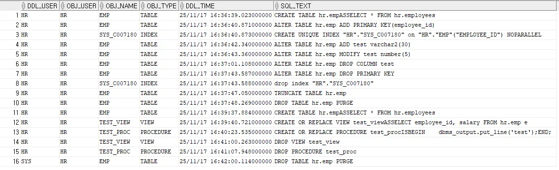 INSERT INTO sys.ddl_obj_log(ddl_user, obj_user, obj_name, obj_type, ddl_time, sql_text) VALUES (ora_login_user, ora_dict_obj_owner, ora_dict_obj_name, ora_dict_obj_type, systimestamp, v_stmt);