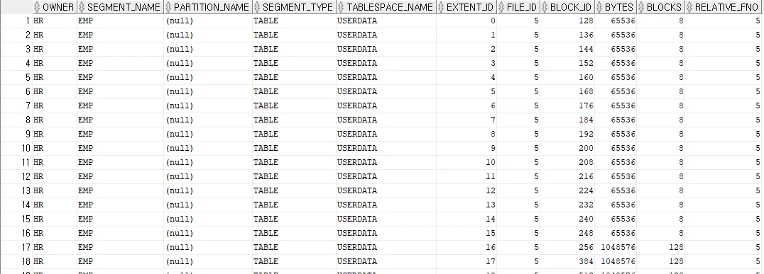 select * from dba_extents where owner = 'HR' and segment_name = 'EMP';