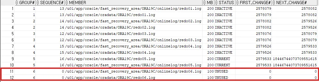 5 0 /u01/app/oracle/oradata/ORA19C/redo05.log 200 UNUSED 0 0