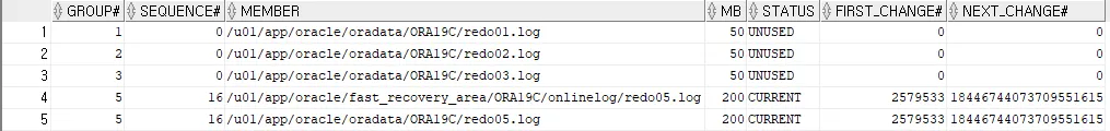 5 16 /u01/app/oracle/oradata/ORA19C/redo05.log 200 CURRENT 2579533 1.8447E+19