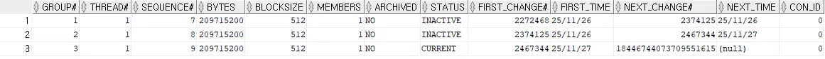 GROUP# THREAD# SEQUENCE# BYTES BLOCKSIZE MEMBERS ARC STATUS FIRST_CHANGE# FIRST_TIM NEXT_CHANGE# NEXT_TIME CON_ID