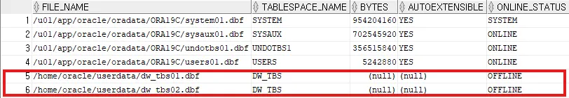 alter tablespace dw_tbs rename datafile '/home/oracle/userdata/dw_tbs01.dbf' to '/u01/app/oracle/oradata/ORA19C/dw_tbs01.dbf';