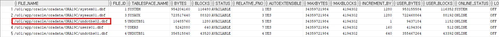 alter tablespace UNDOTBS1 add datafile '/u01/app/oracle/oradata/ORA19C/undotbs02.dbf' size 10m autoextend on;