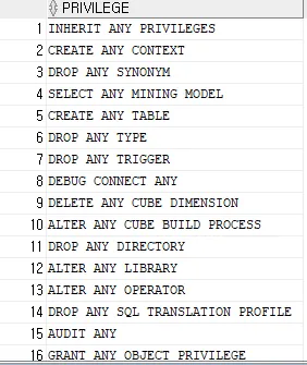select distinct privilege from dba_sys_privs where privilege like '%ANY%';