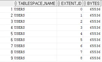 select tablespace_name, extent_id, bytes from dba_extents where segment_name = 'REORG_TEST';