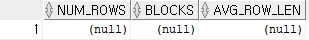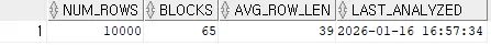 select num_rows, blocks, avg_row_len, to_char(last_analyzed, 'yyyy-mm-dd hh24:mi:ss') last_analyzed from dba_tables where table_name = 'REORG_TEST';