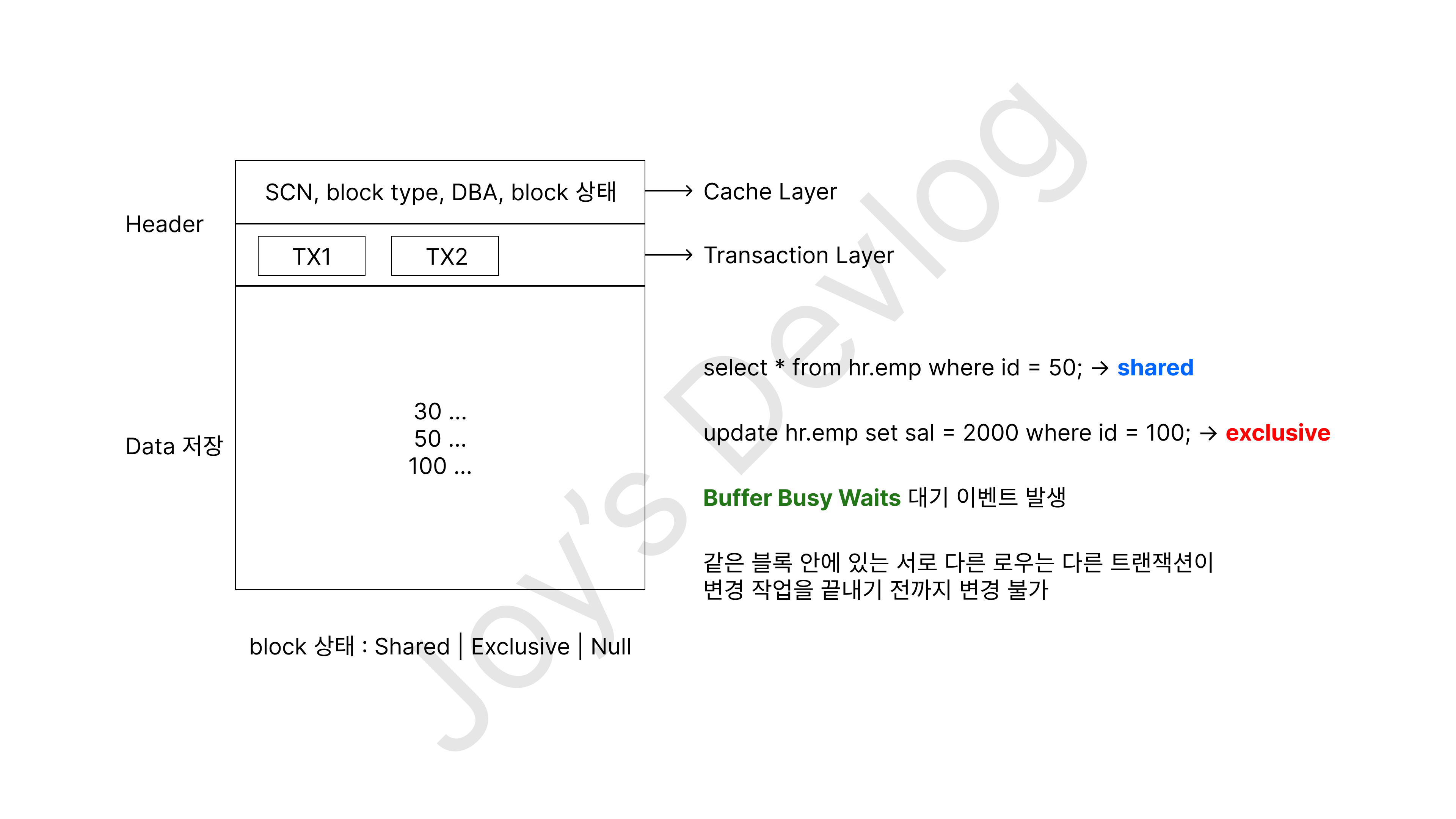 - 블록 header에 있는 buffer lock(exclusive)은 해지
