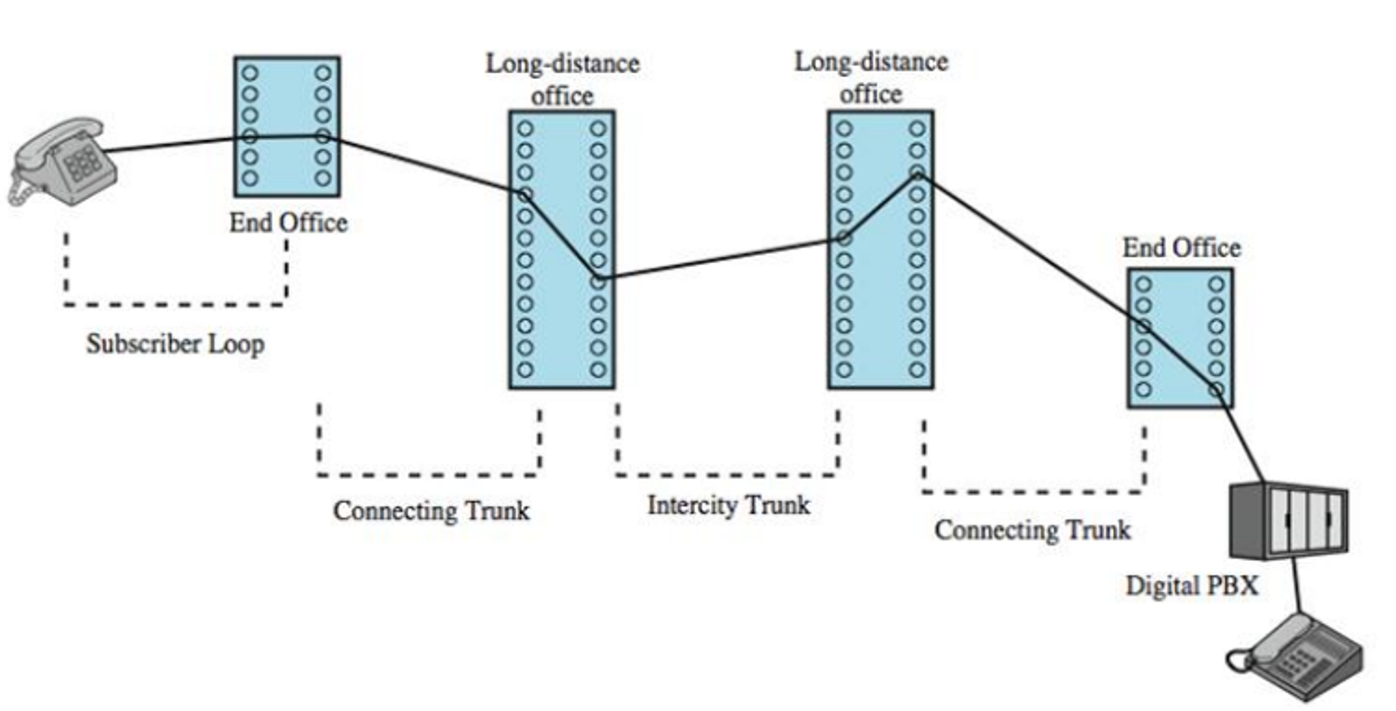 - Trunk : 교환기와 교환기 사이의 연결, 일반적으로 용량이 큼, 다중화 기법 사용(frequency division, time division)