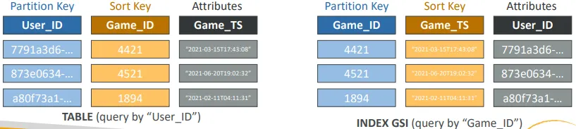 - 테이블에는 프로비저닝된 읽기/쓰기 용량 단위(RCU/WCU)를 반드시 설정해야 함