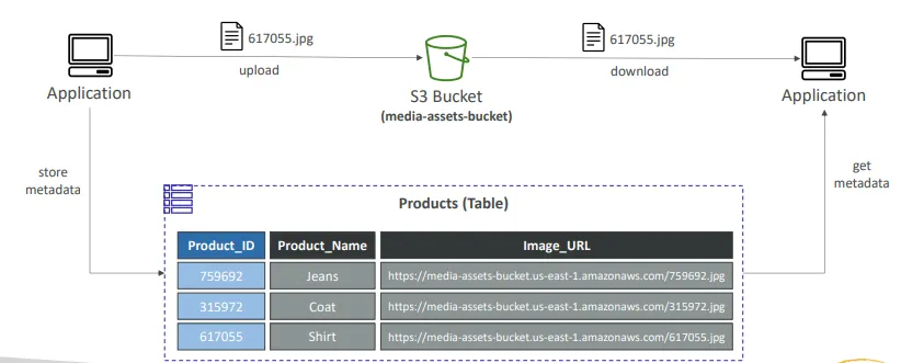 - 대용량 바이너리 데이터(BLOB) 저장 → 데이터는 S3, 메타데이터는 DynamoDB
