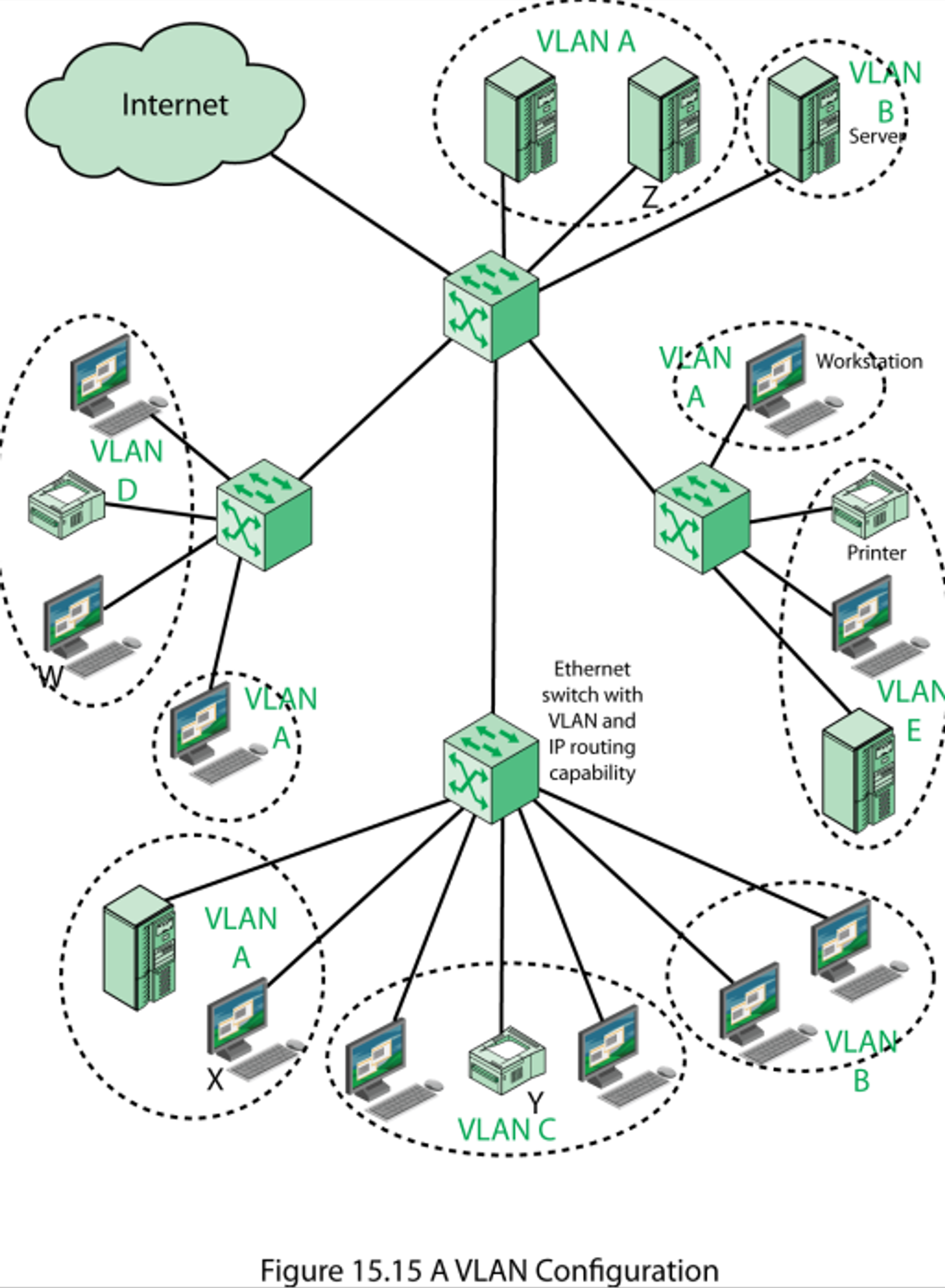 • 물리적으로 떨어진 LAN을 소프트웨어적으로 같은 그룹으로 묶을 수 있음 : virtual LAN