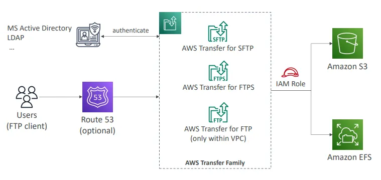 - FTP 프로토콜을 사용하여 Amazon S3 또는 Amazon EFS로의 파일 전송을 완전관리형으로 제공하는 서비스