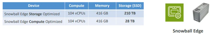 - Snowball Edge Compute Optimized(해당 용도에 특화됨) 및 Storage Optimized 모델 제공